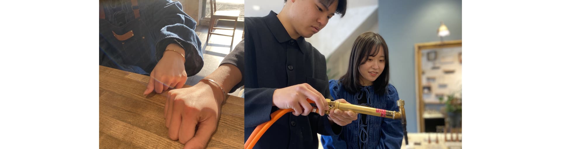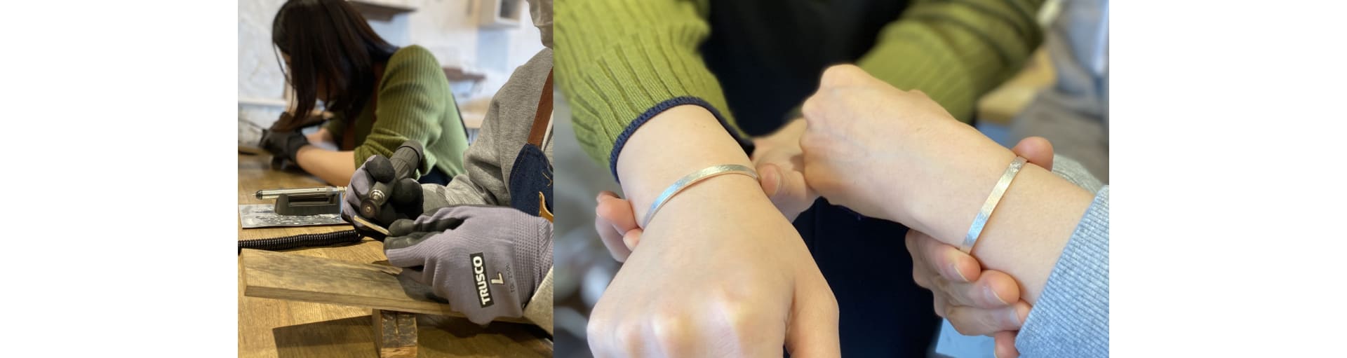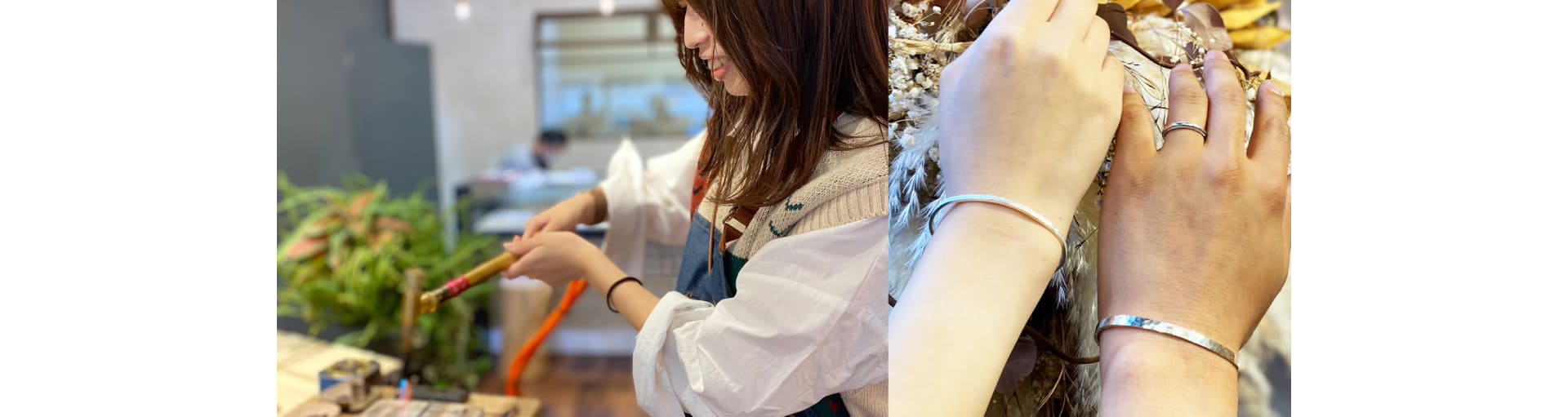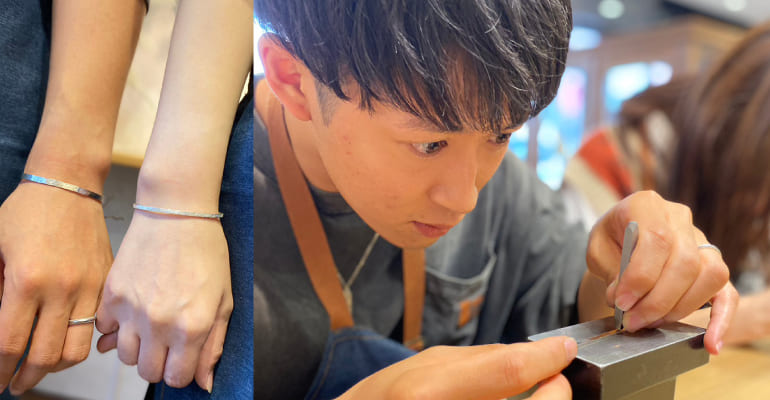 うつくしみ久留米店の手作りバングルは、シルバー素材を使ってお客様自身で叩いたり削ったり仕上げをして制作することが出来る体験型ジュエリーです。記念日や旅行の思い出に作ったり、ファッションとしてご自分用に仕立てすることが出来るシルバーバングルです。