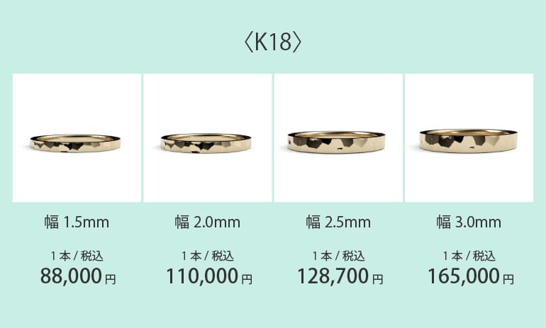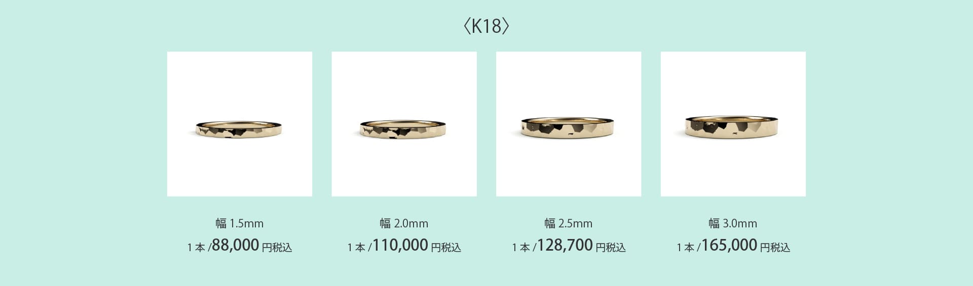 指輪の表情を変えるテクスチャーは様々なパターンを無料でご用意しています。基本料金に含まれていますので、お好みの表面加工をお選びください。テクスチャの種類によってハンマーで叩いたり、ヤスリで削ったりとおふたりの個性でオリジナリティ溢れる指輪に仕上げてふたりだけの結婚指輪が出来上がります。またテクスチャを組み合わせることも出来ますのでお気軽にご相談ください。